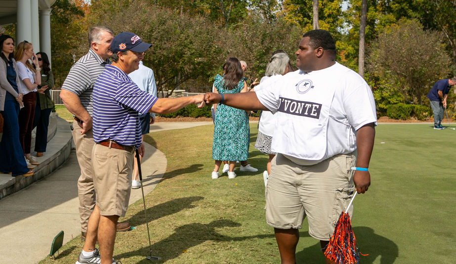 The 3rd annual EAGLES Classic took place on a beautiful Friday fall afternoon at the Auburn University Club. This year’s tournament Corporate Sponsor was Nick Davis and Momma G’s Deli. Golfers were greeted by Aubie and several EAGLES students during registration, and then enjoyed a delicious box lunch provided by J. Davis and Country Club of Auburn. Coach Butch Thompson welcomed the guests before the competition heated up at the Wiregrass Construction Putting Contest between Team Andrew, Team Bradley, Team D’Vonte, Team Kyle, and Team Philip. The youngest player in the field, Prather Reaves, from Team D’Vonte, sunk his championship putt to take home the cash (which he graciously donated back to The EAGLES Foundation). The teams jumped in their carts and headed to their holes for the shotgun start. After a wonderful afternoon of competition, Trip Griswold, Griffin Stevens, Mason Seaborn and Clay Branch took the prize for 3rd place, Rick Stukes, Larry Thorne, Mike Lewis and Chris Williams came in 2nd place, and Randy Campbell, Jimmy Bassett, Chad Prewett and Jeff Reese came in 1st place.